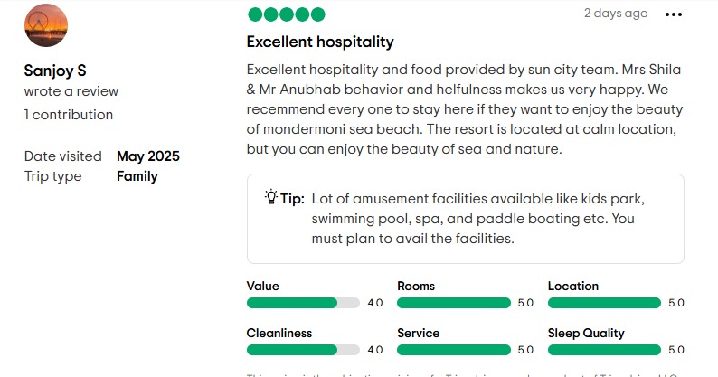Ayanika Saha, Couple Traveller We stayed at sun city resort for 2n/3d. Our stay was very pleasant and very peaceful. The food was good, room service was very good. The view from the room was best. So if you are in search of a place which is stuck in time, this place is for you. It’s an amazing place for we time. It’s just that if the place would have been given a little more maintenance as the things inside the resort are eye-catching and if the hype is back then it will be a marvelous destination.